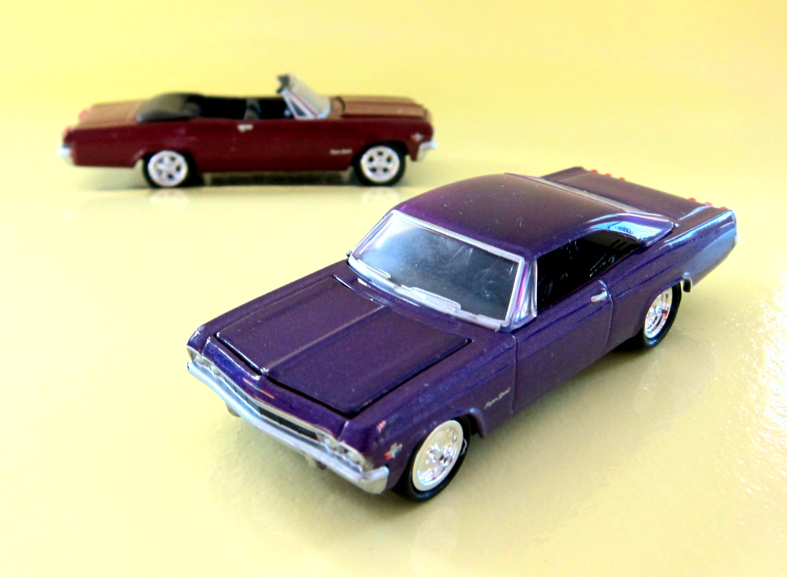 Pictured here is the Chevy Impala after a wheel upgrade. I couldn't do anything with the original wheels, which were like little donuts, so I ended up drilling out the base to replace the wheels. Pictured in the background is the maroon 65 Impala from 40th Anniv R8. I didn't recall doing a rim swap on it but looking back at the original pictures on